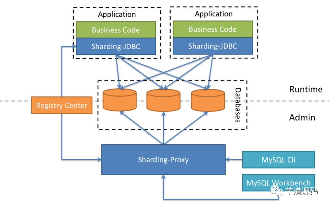 Apache ShardingSphere 是多接入端共同组成的生态圈。通过混合使用 ShardingSphere-JDBC 和 ShardingSphere-Proxy,并采用同一注册中心统一配置分片策略,能够灵活的搭建适用于各种场景的应用系统,使得架构师更加自由的调整适合与当前业务的最佳系统架构。