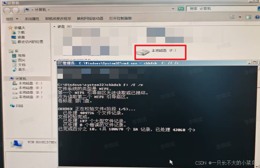 硬盘有问题基本都是chkdsk 命令走一波,我是F盘有问题,所以选择了F盘,不要带/r否者耗时非常久。