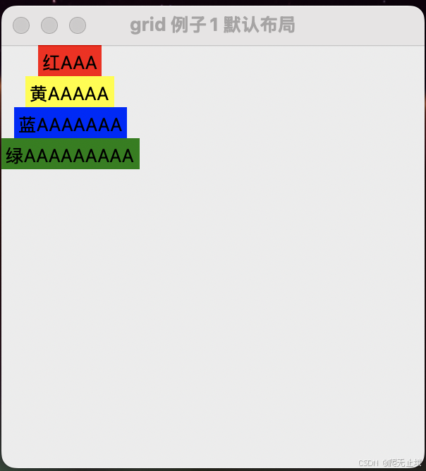 中文含义"网格"。名称体现了布局的方式:将父容器划分成 行(row)和列(column)组成的网格,然后根据网格坐标将控件放置在指定的位置上。