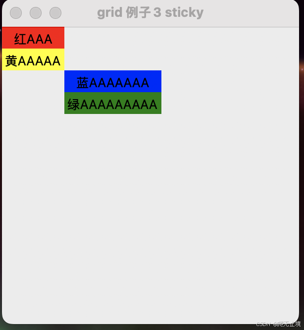 row和column来设置控件之间的位置。 sticky用于定义控件在单元格内的对齐方式。作用类似于单元格内对空余父容器进行填补。rowspan和columnspan用来让控件跨越多个行或列。padx、pady、ipadx、ipady用来控制控件的外边距和内边距,即控件和周围空间的距离。