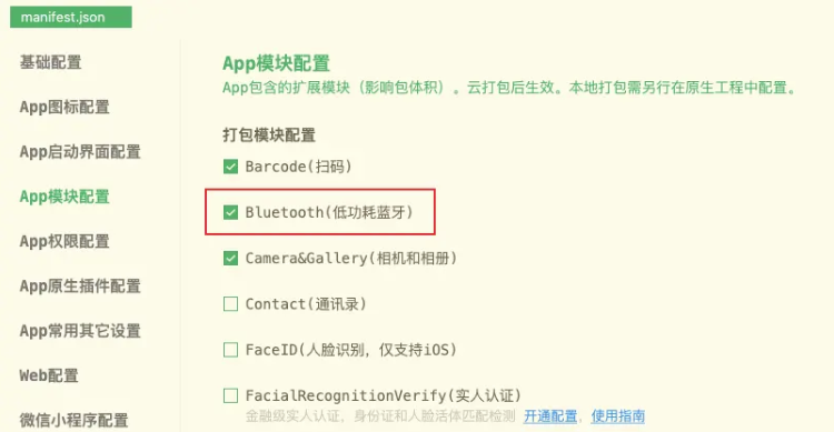 只有添加了这个模块,我们在使用打包的时候,才能将 Bluetooth(低功耗蓝牙) 模块编译到应用包内,我们才能正常的使用蓝牙功能。
