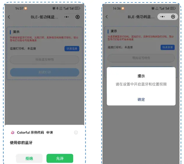 如果是微信小程序,需要开启微信的蓝牙权限,小程序的蓝牙权限。