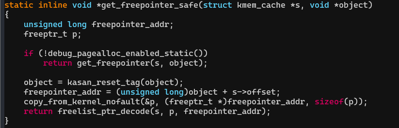 kmem_cache->offset指向的就是object中的freeponiter,freepoint中装的就是下一个可用object的地址。将freepointer中的内容copy给p以后,再经过其他加工然后返回。