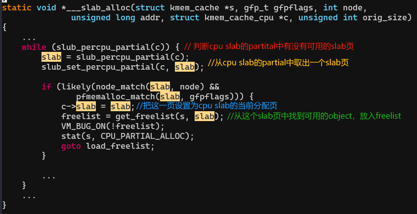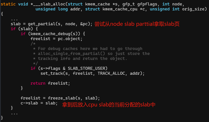 __slab_alloc调用___slab_alloc,定义在mm/slub.c 中。