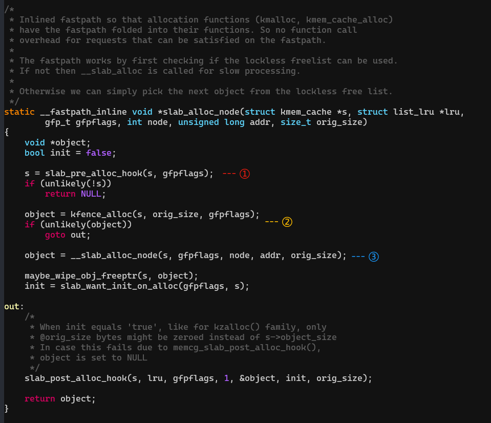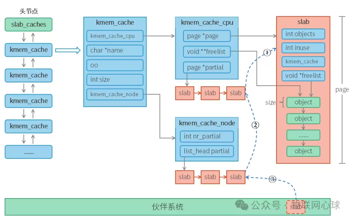 (2)慢速路径:如果cpu slab没有空闲的object,则需要先检查node slab是否有空闲object,如果有则从slab链表摘除slab插入cpu freelist,如果没有则从伙伴系统申请slab并插入cpu freelist。