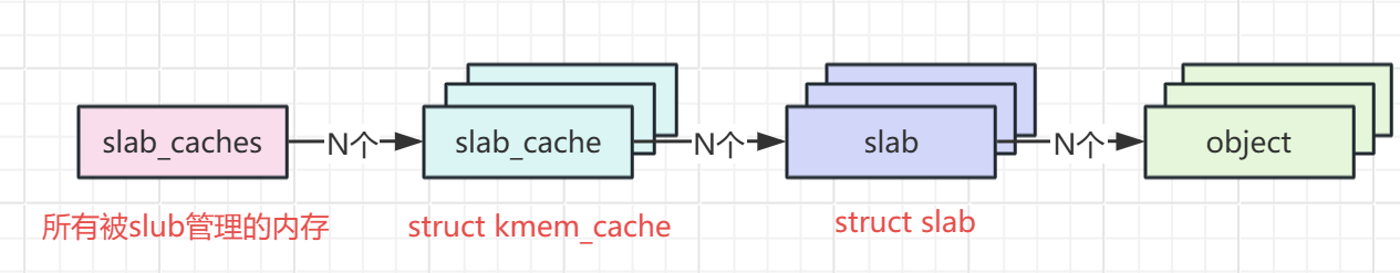 一个slab cache可以理解为多个slab的集合,在实现上一个slab有一个或多个连续的物理页组成(通常只有一页),将slab根据size大小划分成一个个object,object就是内存分配的对象。