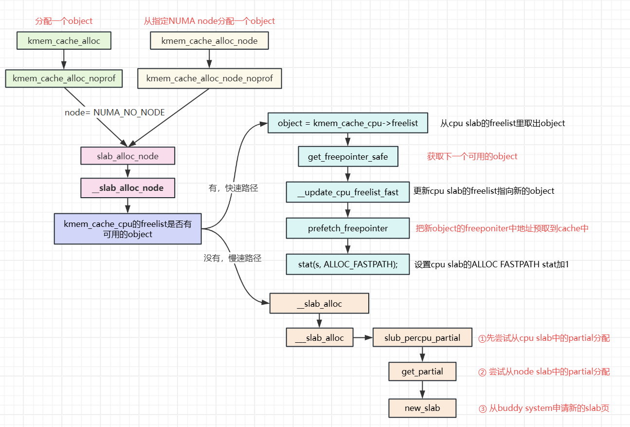 (1)快速路径:如果slab(freelist或partial slab)还有空闲的object对象,则直接从cpu slab申请object。