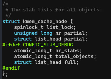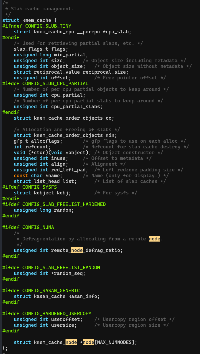 - node:是为每个NUMA node保存slab信息struct kmem_cache_node。相当于拥有一个全局的slabs列表,尚未绑定到任何CPU,但是也仍然属于cache,也会包含已经分配的objects。