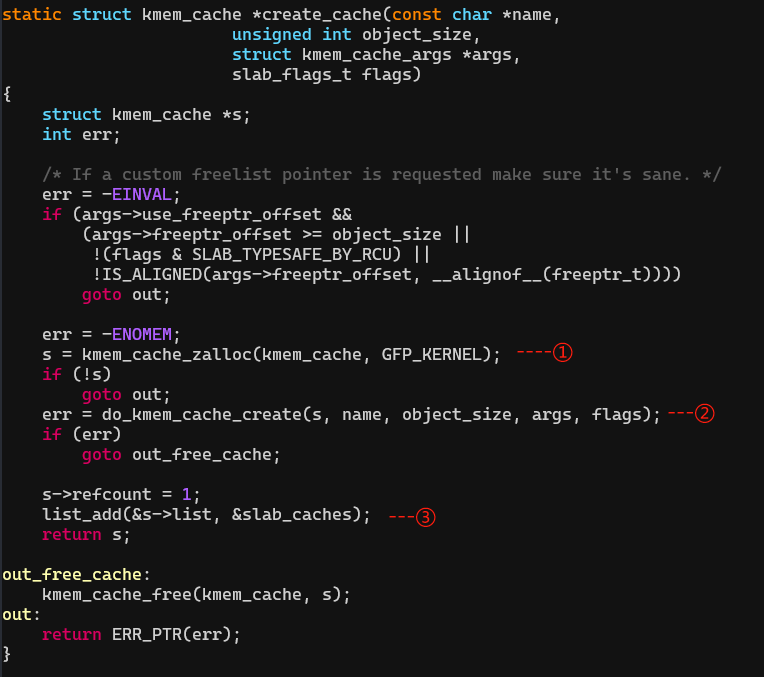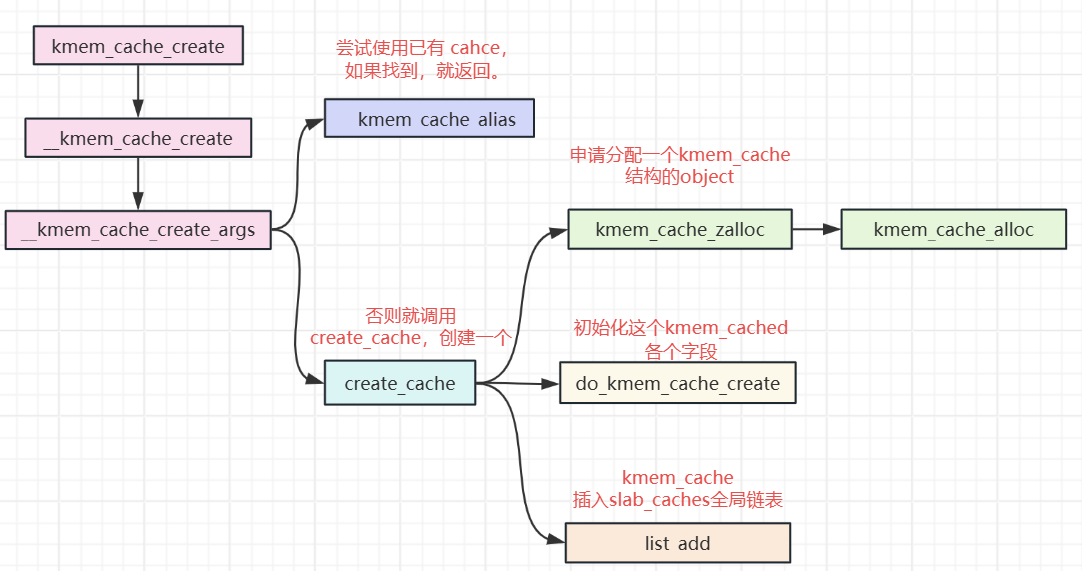- kmem_cache_create:创建kmem_cache,成功后返回一个kmem_cache的指针。