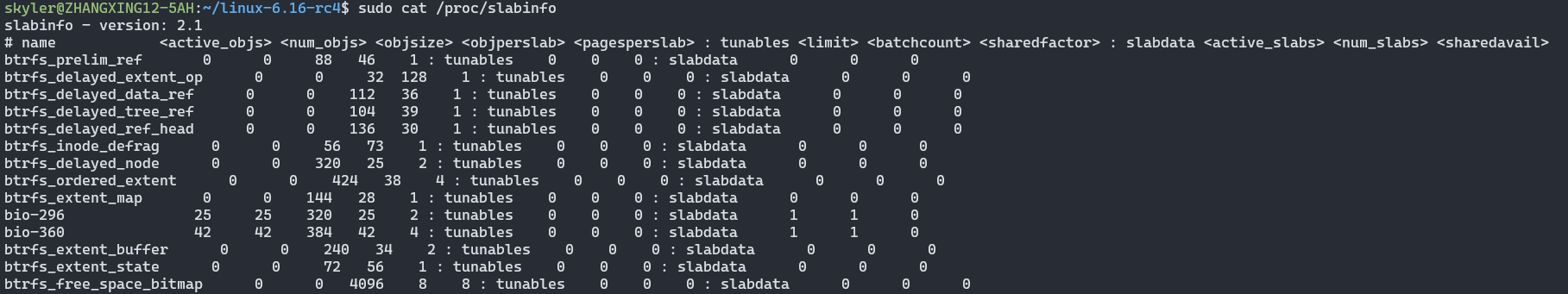 - name:每个kmem_cache都有自己的名字,可以通过/proc/slabinfo查看。name通过kmem_cache_create函数创建kmem_cache指定。