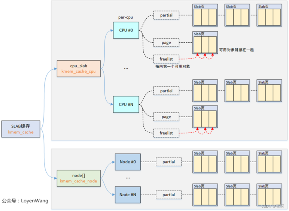 - cpu_slab: 为每个CPU core分配独立的kmem_cache_cpu结构, 每个core通过自己的kmem_cache_cpu直接从本地缓存分配内存对象。