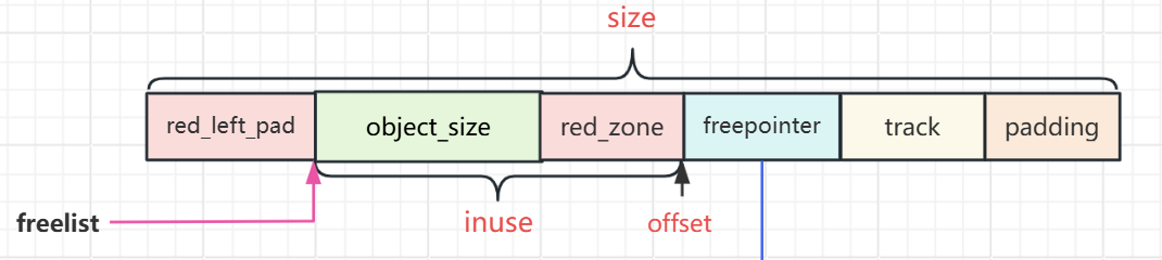 slub分配器的最小单元。一个object由red left pad,object内存区域,red zone,freepinter,track,padding等部分组成。