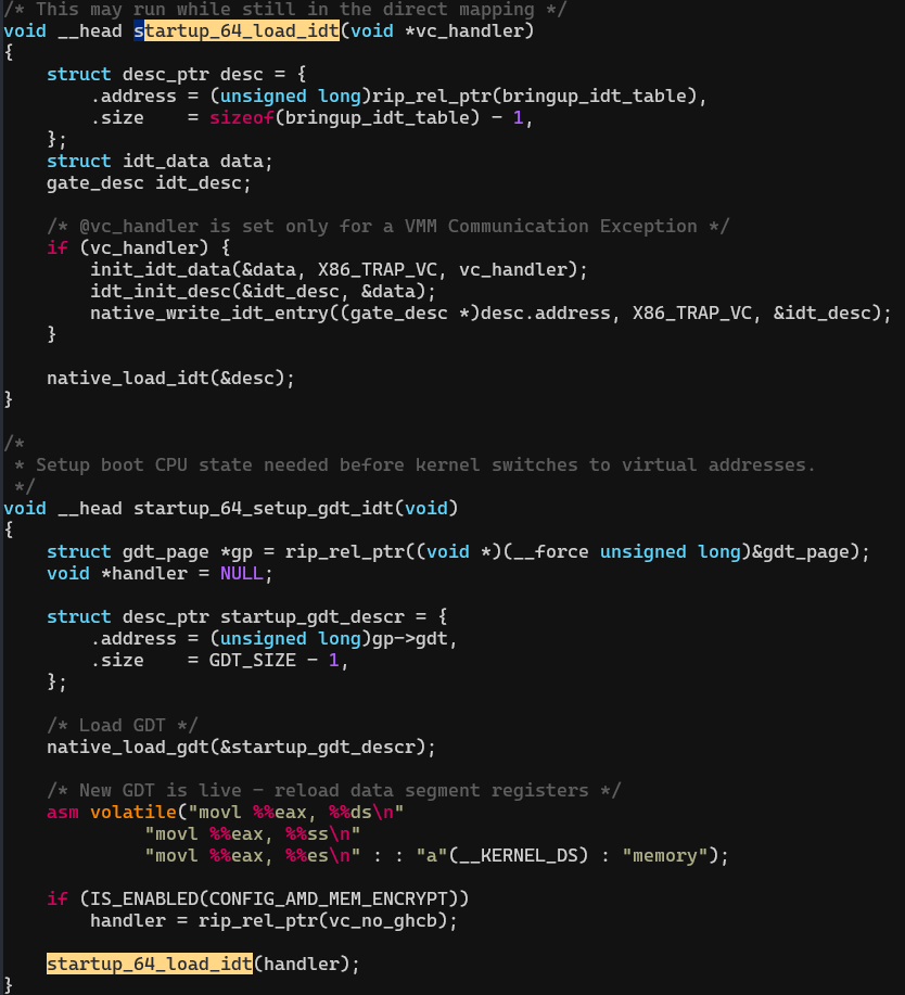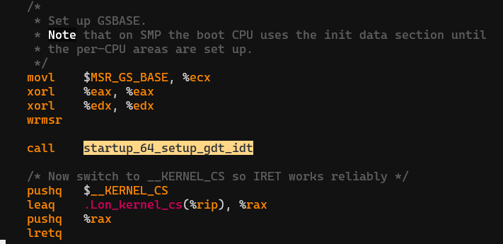 startup_64_setup_gdt_idt定义在arch/x86/boot/startup/gdt_idt.c中。它的任务是在内核切换到虚拟地址运行前,设置GDT和IDT。调用startup_64_load_idt对IDT进行设置。