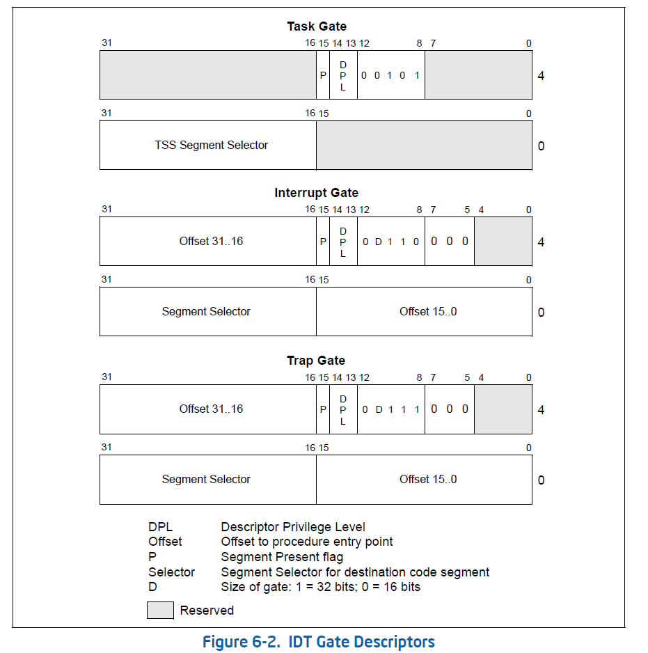 参考Intel® 64 and IA-32 Architectures Software Developer’s Manual Volume 3 6.11 IDT DESCRIPTORS.