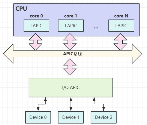 - LAPIC:本地APIC,内置在CPU中。每个CPU core有一个专属的LAPIC,负责处理