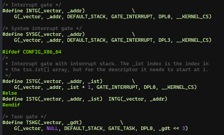 - 中断门(interrupt gate):本质是Intel中断门,DPL(标识特权级)字段为0。Linux所有的中断处理程序都通过中断门激活,并全部在内核态。