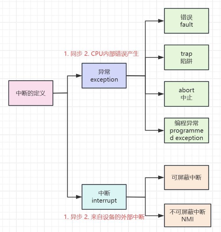 - 同步中断,由CPU内部错误生成 - exception(异常)
