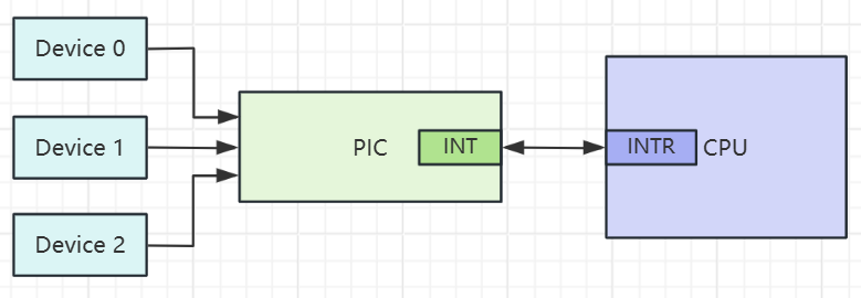 外部设备连接到PIC上,PIC的INT引脚连接CPU的INTR引脚。