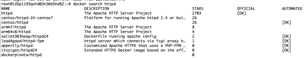 我们也可以使用 docker search 命令来搜索镜像。比如我们需要一个 httpd 的镜像来作为我们的 web 服务。我们可以通过 docker search 命令搜索 httpd 来寻找适合我们的镜像。