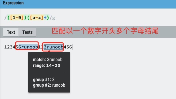 runoo+b,可以匹配 runoob、runooob、runoooooob 等,+ 号代表前面的字符必须至少出现一次(1次或多次)。