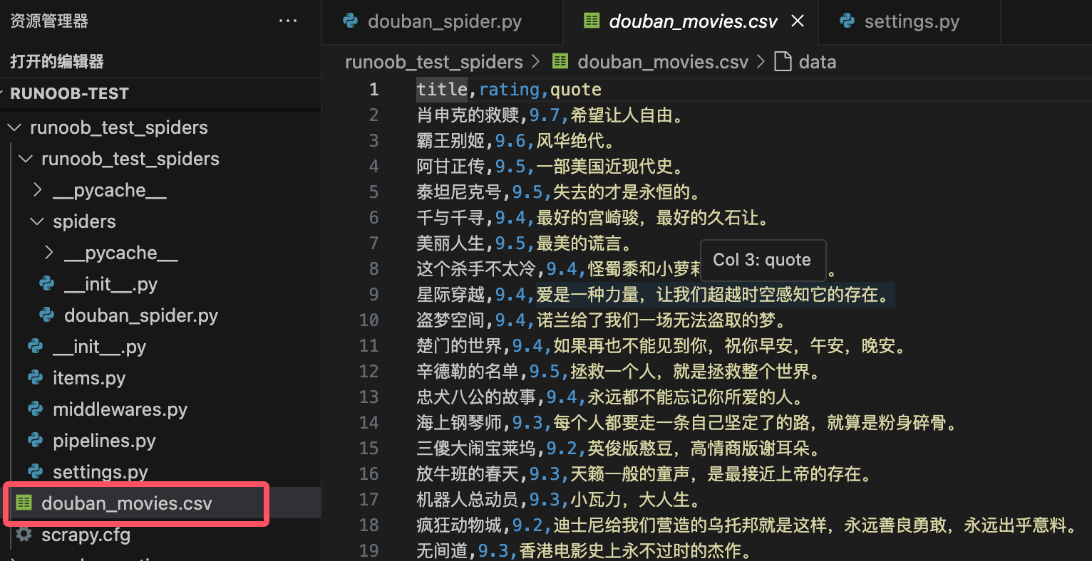 runoob_test_spiders 目录下生成一个名为 douban_spider.py 的文件,代码如下: