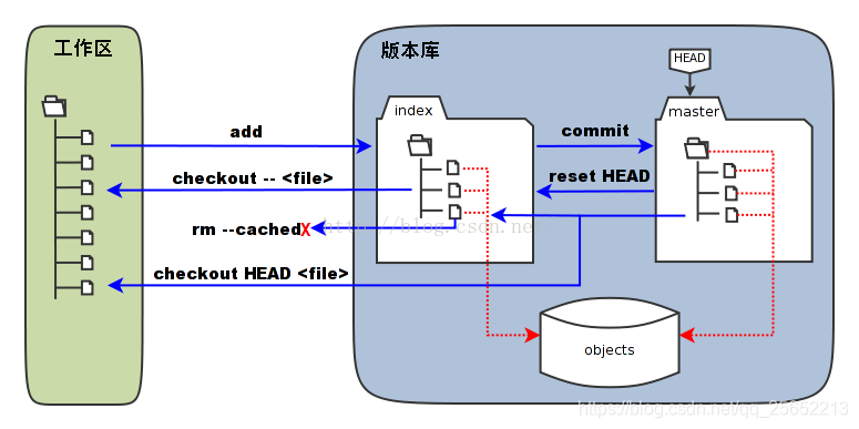 什么是Git:在初始化git版本库之后会生成一个隐藏的文件 .git,这个文件可以理解成为git的版本库repository,而我们自己建立的项目文件夹就是工作区working directory,在 .git文件夹中有很多文件,其中有一个index文件,就是暂存区也可以叫做stage,git还为我们自动生成了一个分支master以及指向该分支的指针head,