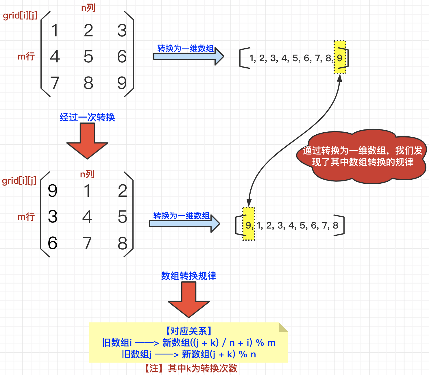 其实在转换过程中,其实存在一定的规律的。为了清楚看到其中的规律,我们可以将二维数组转换为一维数组。那么对比转换前后的两个一维数组,我们可以非常清晰的看到其中的规律,也就是,在每次迁移过程中,数组中每个元素都会向后移动1位。如果一共要移动6次的话(即:k=6),那么一维数组中每个元素都会向后移动6位,当然,对于越界的元素,都会再次插入到数组的头部。根据如下规律,我们可以找出从旧二维数组转换为新一维数组的规律公式,这样k就会作为转换公式的参数,一次性的就可以获得最终转换后的二维数组。具体逻辑如下所示: