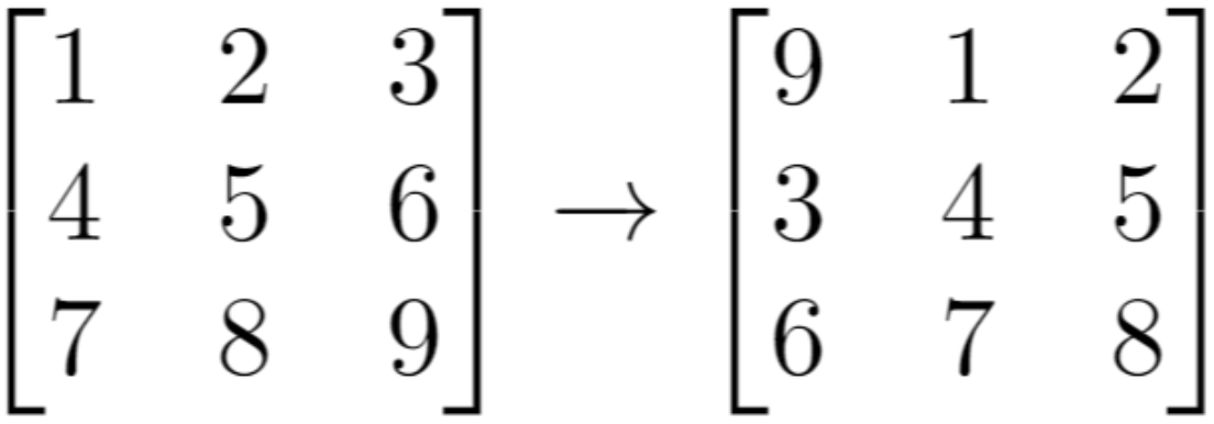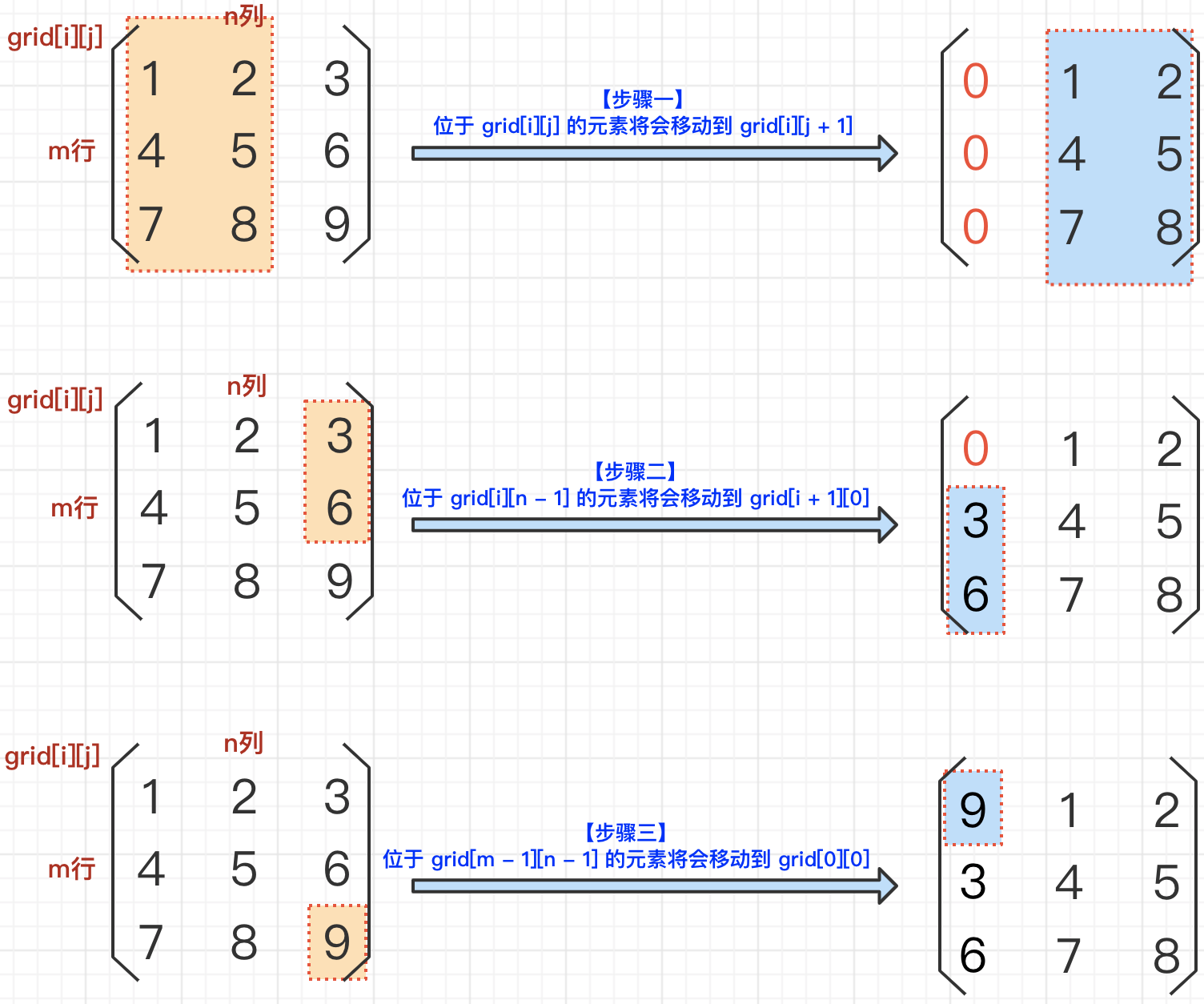 grid[m - 1][n - 1]的元素将会移动到grid[0][0]。