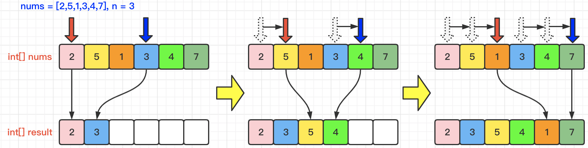 根据题目描述,我们很容易想到通过创建一个新的数组,然后再将旧的数组中的元素,按照一定的规律,迁移到新的数组即可。那么题目中给出的数组长度是2 * n,那么要求最终的数据是nums[0],nums[n],nums[1],nums[n+1],……,所以我们只需要遍历数组nums长度的一半,即:n的长度就可以了。如下图中的红蓝两个指针,红色指针为i,那么蓝色指针为i+n,然后依次将获取到的数据保存到新的数组即可。具体操作如下图所示: