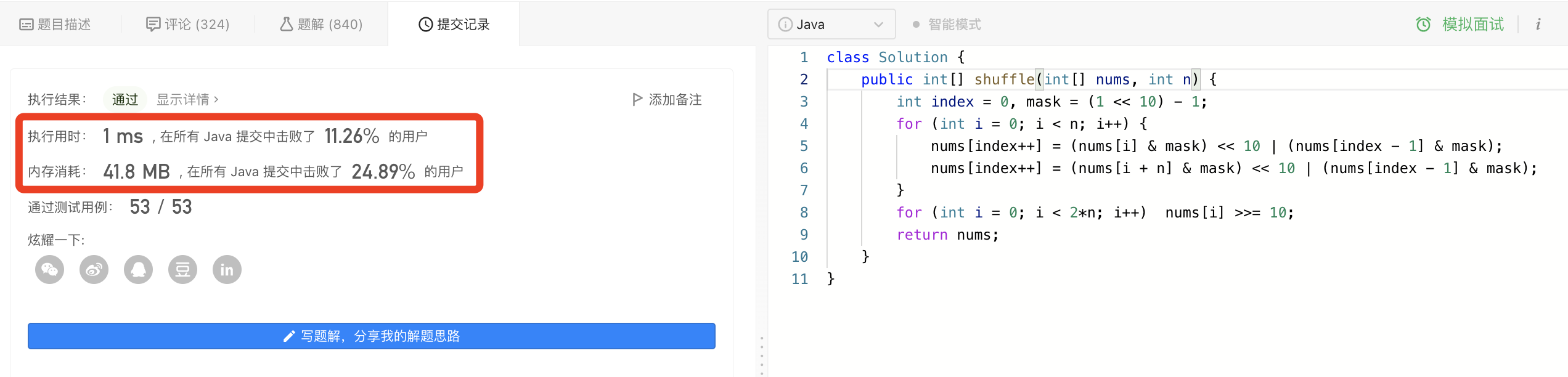 nums[index++] = (nums[i + n] & mask) << 10 | (nums[index - 1] & mask);