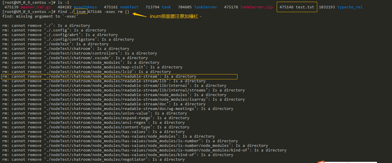 我刚才测试时,就在 inum 前少加了横杠 (正确应该为 -inum)。导致整个命令删除了其它目录文件,如下图。