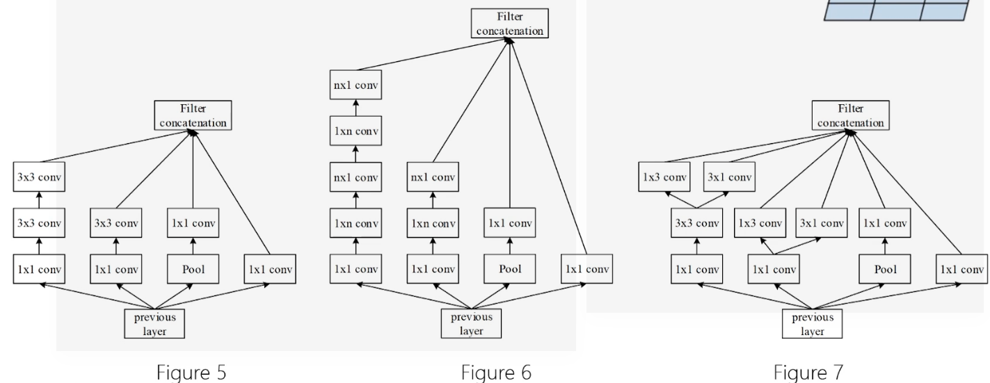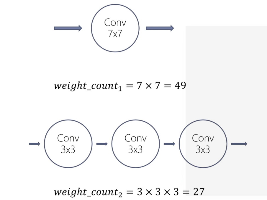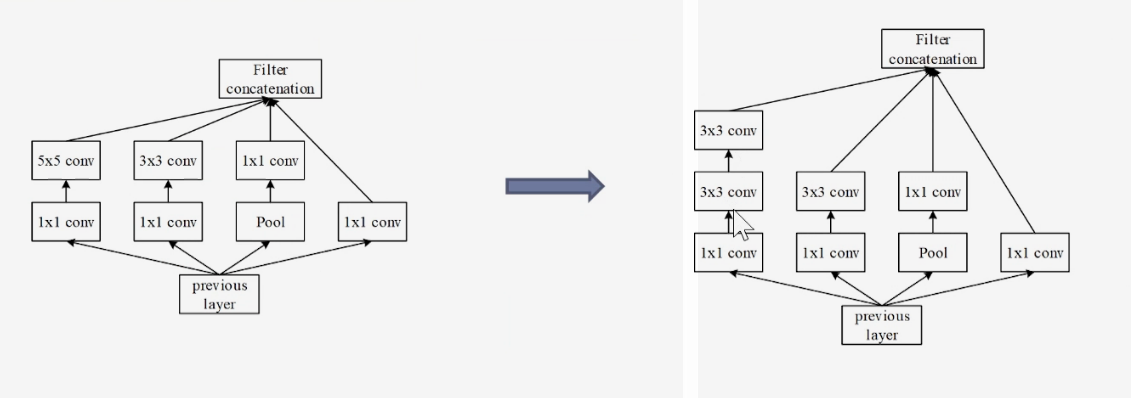 原因:是一个\(5*5\)conv和两个\(3*3\)conv的感受野大小相同;每个卷积层加入Relu,两层\(3*3\)conv决策函数区分能力更强。