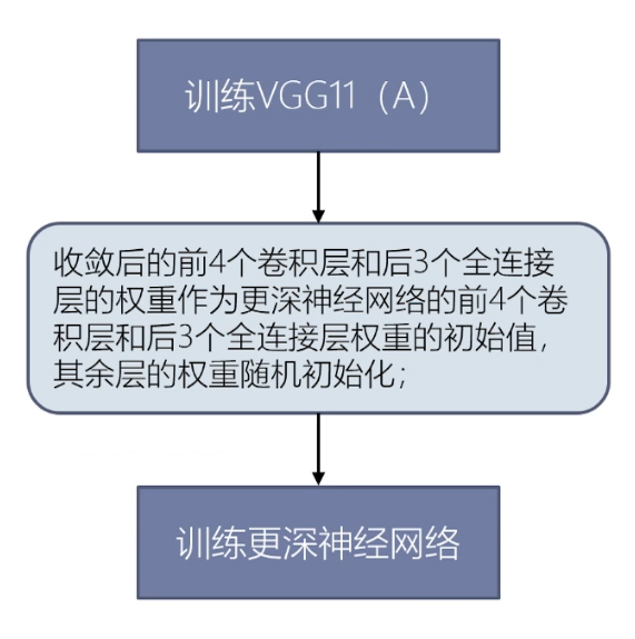 所以VGG先训练11层网络。用收敛后的前四个卷积层和后3个全连接层的权重作为更深神经网络的前四个卷积层和后3个全连接层的初始权重,其余层的权重随机初始化。