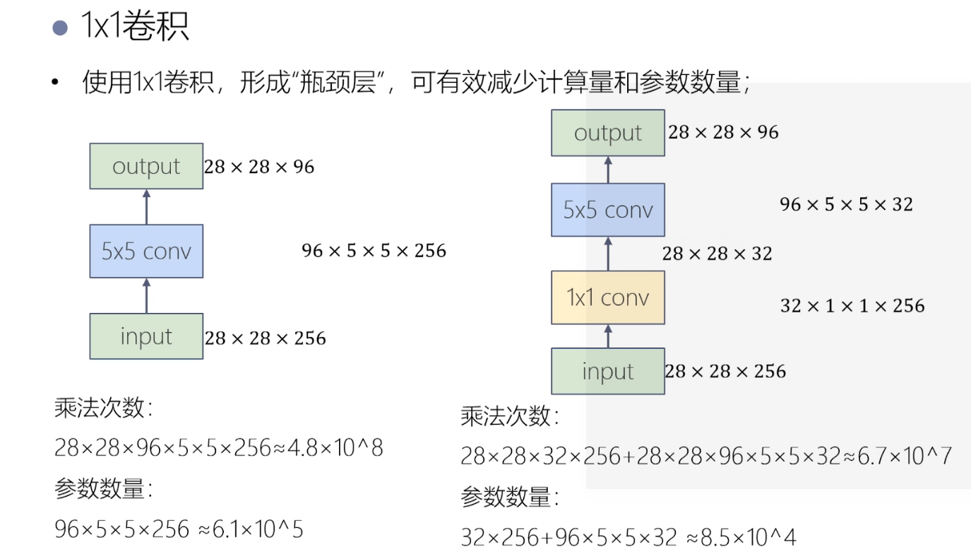 - Dimension redutions : 使用1*1 的卷积层来缩减维度(减少channel),形成“瓶颈层”,减少参数。