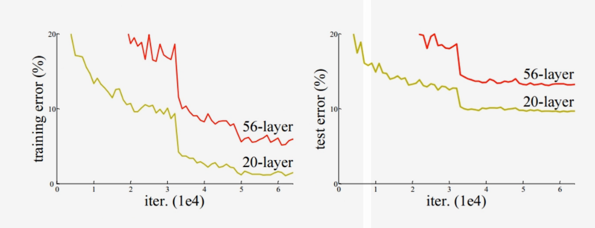 实验:分别用20层和56层卷积神经网络在cifar10数据集上进行训练和测试,发现更深的网络的错误率更高,在ImageNet数据集上也同样如此。