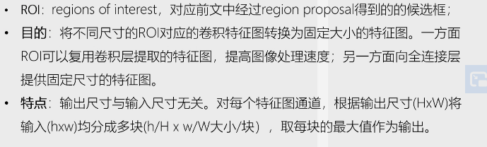 - ROI-Pooling: 根据 映射关系,将 不同尺寸的候选框 在 特征图上的对应区域 池化 为 维度相同的特征图 (因为全连接层要求输入的尺寸固定)。