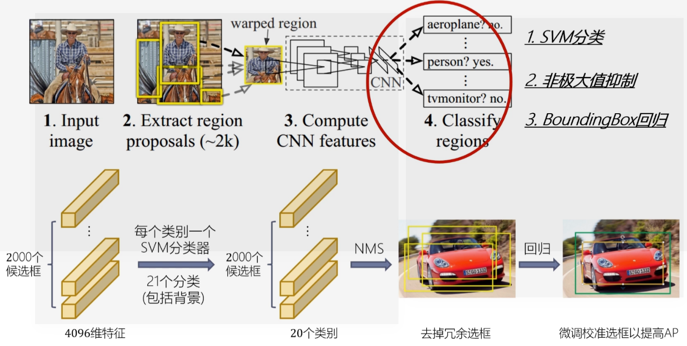 - 线性分类: 用特定类别的线性SVMs 对每个候选区域做分类。