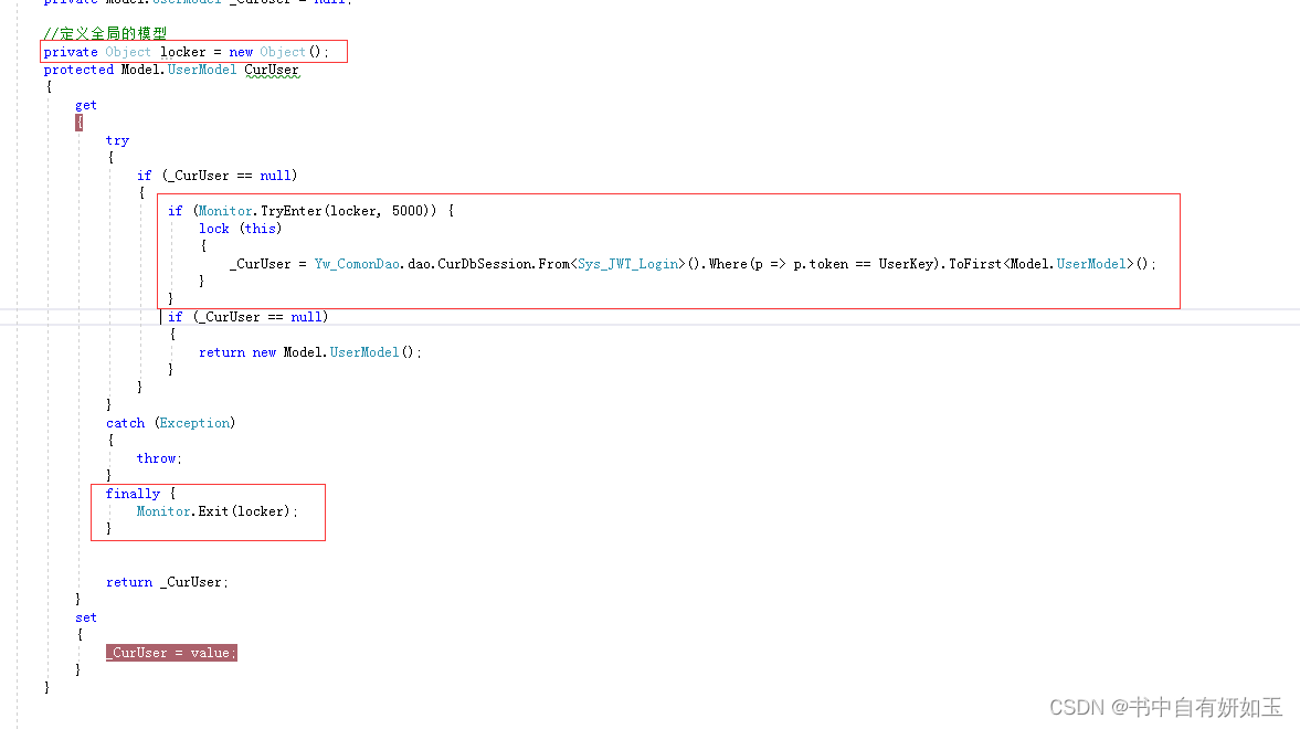 当多线程同时用到一个对象时,也会出现和公用代码类似的问题,这时就不能用lock关键字了,需要用到System.Threading中的Monitor类,监视器,其提供了使线程共享资源的方案。其可以锁定一个对象,一个线程只有得到这把锁才可以对该对象进行操作。对象锁机制保证了在可能引起混乱的情况下同时只有一个线程可以访问这个对象。使用方法如下: