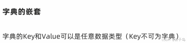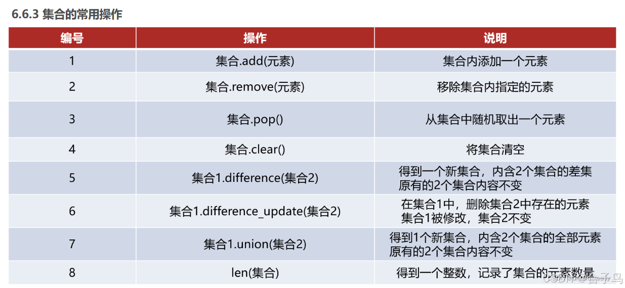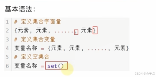 无序 ,类似数学集合,内容不可重复,内容可以修改,不支持下标索引(所以不支持while循环),支持for循环,符号为 { }