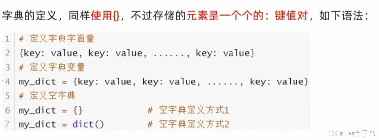 同样使用符号 { } ,不过,内容是键值对,dir = {a:b, c:d },其中 key 和 value 数据类型不限