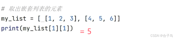 2、列表的下标索引,用中括号,例如 list_A[0],与数组类似,可以反向索引 list[-1] 代表最后一个元素(超出元素范围会报错)