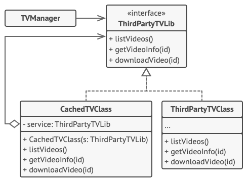 这个时候就可以添加一个代理类(这个代理类实现和原视频下载类相同的接口),该代理类将所有工作委派给原下载器。不过代理类也不是什么都不做,代理类能够保存所有的文件下载记录, 如果程序多次请求同一文件, 它会返回缓存的文件,这样便可以完成优化。
