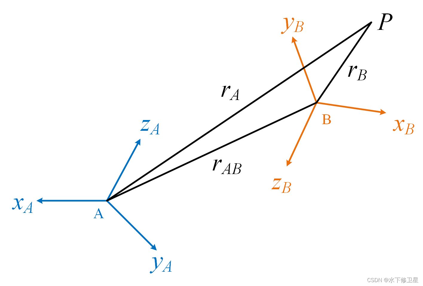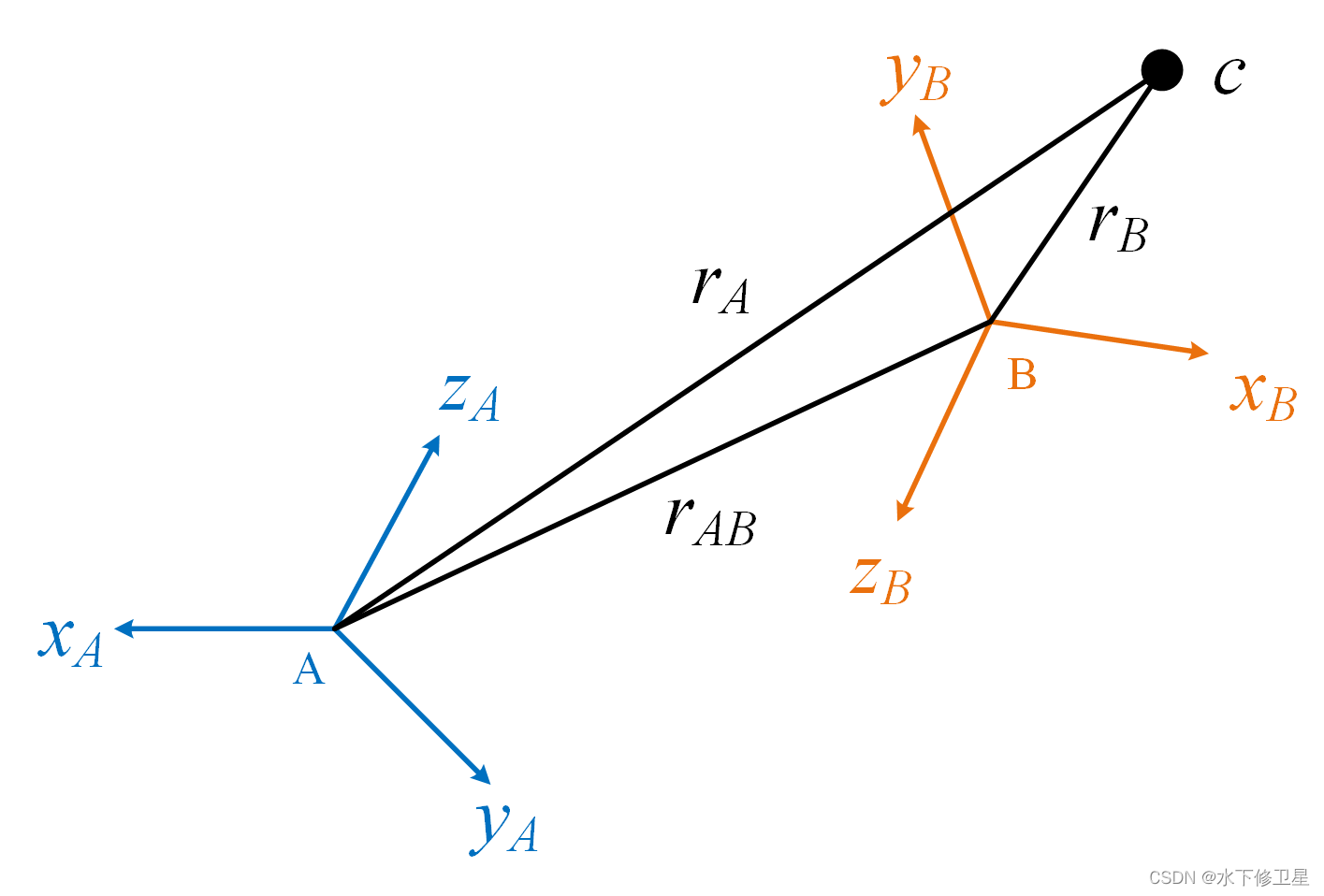rA=rAB+ARB⋅BrB\boldsymbol{r}_{A}=\boldsymbol{r}_{AB}+^{A}\boldsymbol{R}_{B} \cdot ^{B}\boldsymbol{r}_{B}rA=rAB+ARB⋅BrB