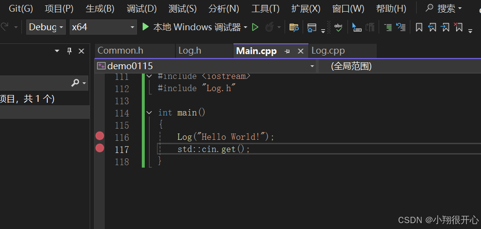 在目标代码前打上断点,选择Debug,选择“本地Windows调试器”,即可进行代码调试。