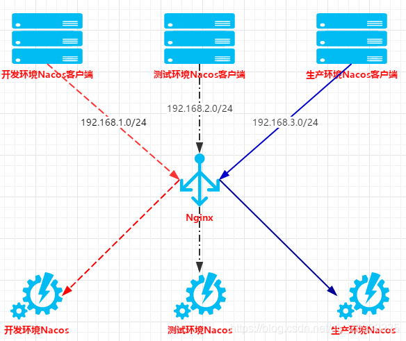 通俗一点说,针对不同环境的配置文件存储在不同的nacos上,nginx通过客户端的IP地址判断客户端所处环境,然后进行路由,从而客户端连接到符合其环境的Nacos上,获取正确的配置文件。客户端不需要根据环境做任何改变。如下图所示: