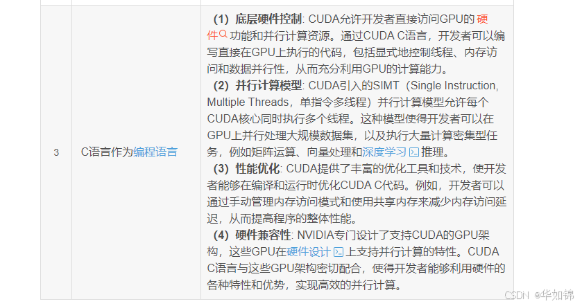 (1)CUDA C/C++:这是 CUDA 为并行编程所扩展的 C++ 语言,专为在 GPU 上编写并行代码而设计。开发者可以使用熟悉的 C++ 语法结构,通过特定的编程模型定义 GPU 任务,让代码更高效地在多线程环境中执行。