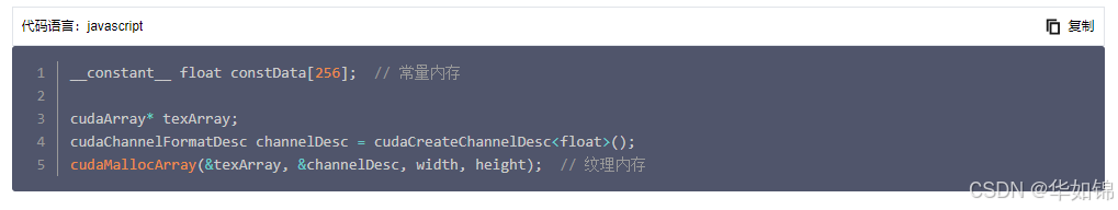纹理内存(Texture Memory):专门优化以支持二维或三维数据的读取,对于非顺序或稀疏访问模式的数据(如图像数据)具有较高的访问效率。