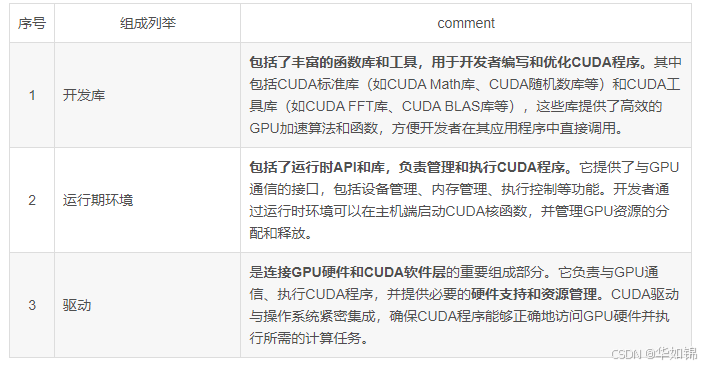 CUDA 不仅仅是一个简单的库,它是一个完整的平台,为开发者提供了利用 GPU 进行高效并行计算的全方位支持。这个平台的核心组件包括: