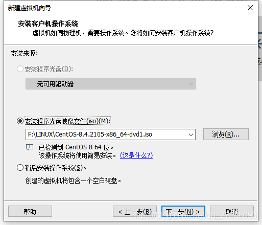 一般情况选择“安装程序光盘映像文件(ios)”,选择Ubuntu镜像文件的路径。如图所示,再点击下一步;(VMware14版本好像识别不到linux8)