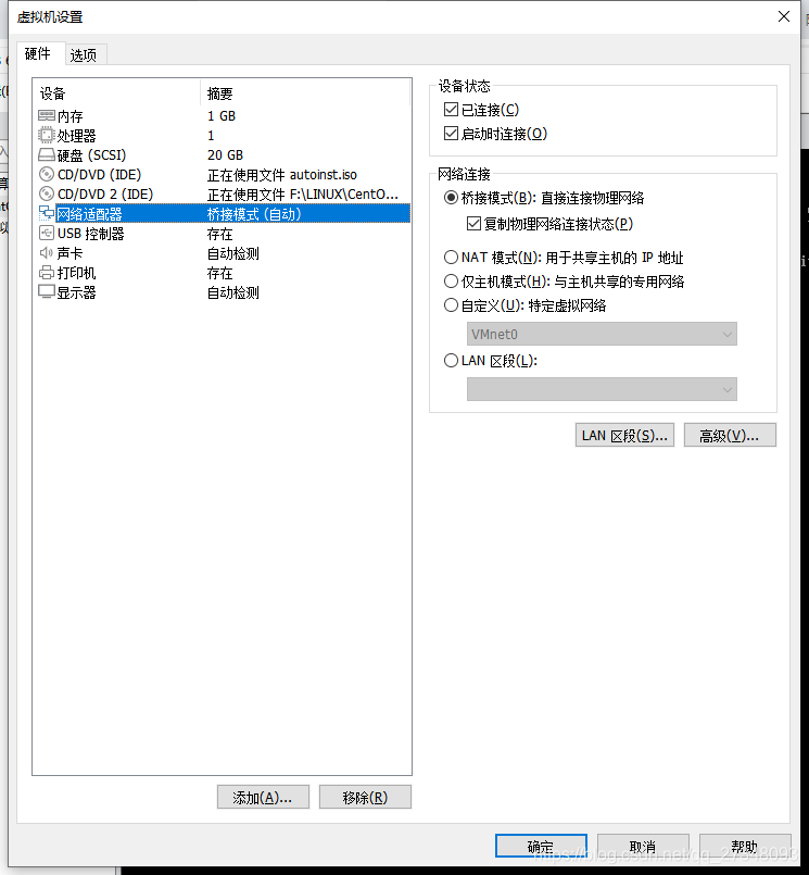 - LAN 区段:这是新版 VMware 新增的功能,类似于交换机中的 VLAN(虚拟局域网),可以在多台虚拟机中划分不同的虚拟网络。